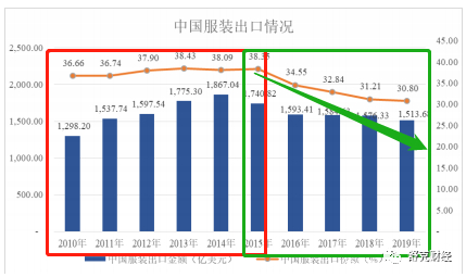 如上,2010-2015年,中国服装出口增速情况就已经连续维持增长乏力的状态,基本维持不动,然到2015年至今,出口瓶颈至增速下滑趋势彻底爆发,增速萎靡态势显现。