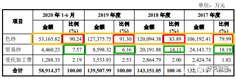 报告期内公司的三大主要收入构成分别为色纱、贸易纱、以及委托加工费。色纱,作为公司的第一大收入支柱,由2017年的收入占比的79.99%一度上涨至2019年占比的91.30%,而贸易纱则由18.19%的销售占比被压缩至6.16%。