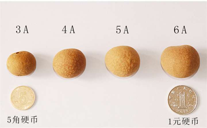 ●大小:同品质桂圆干,颗粒越大,品质越好,价格越高,意康德桂圆干为市场最大规格,直径在2.5厘米以上,不同大小桂圆干对比图如下: