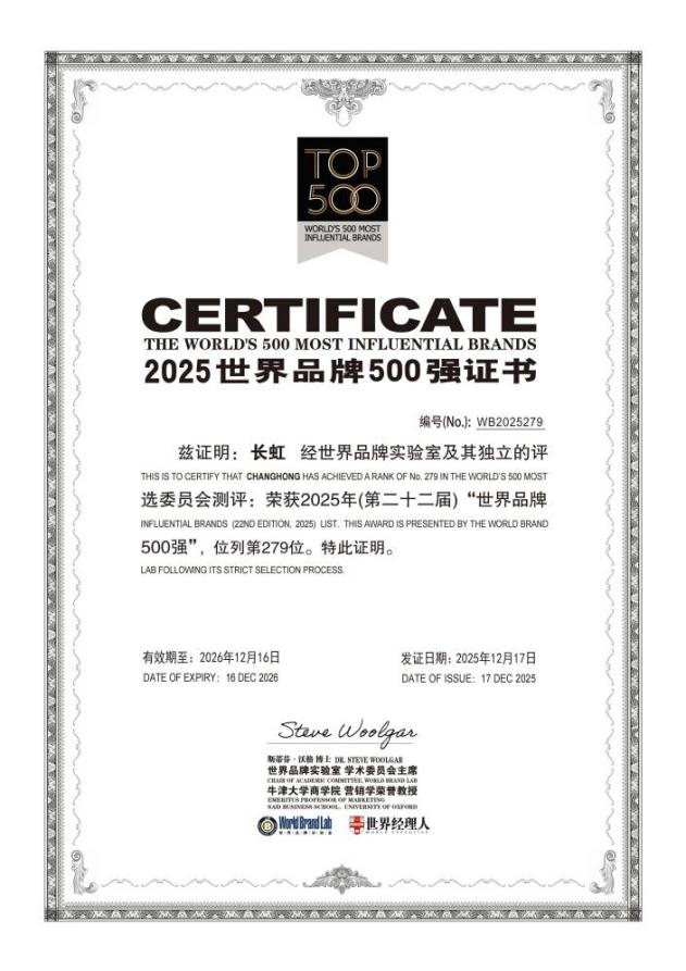 12月17日,世界品牌实验室(World Brand Lab)发布2025年度(第二十二届)《世界品牌500强》。榜单显示,中国入选品牌数量已增至50个,稳居全球第三。其中,值得关注的是,科技家电制造行业的“常青树”——长虹,其全球排名较2024年上升4位,位列第279位,