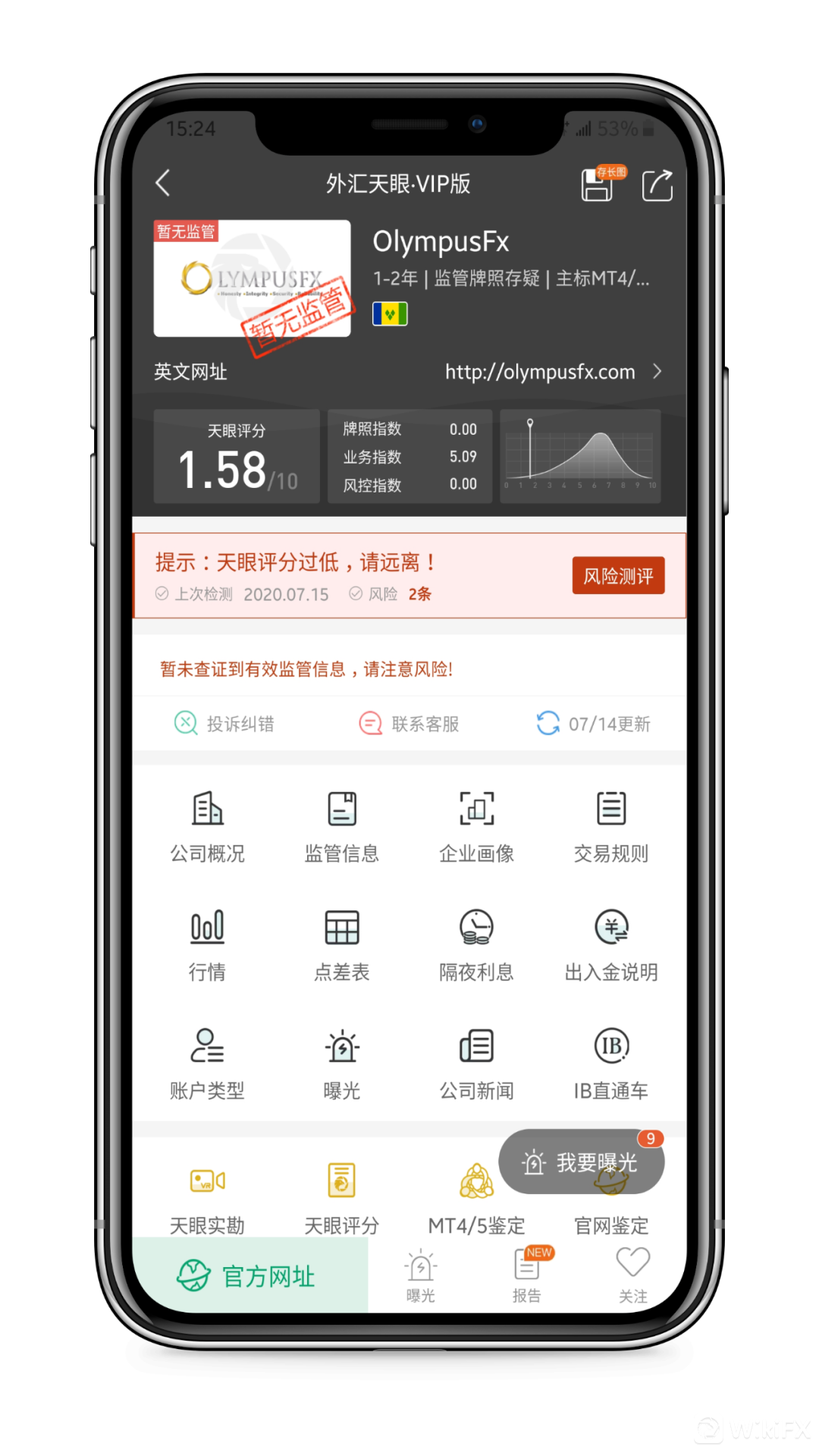 在外汇天眼APP中Olympusfx的主页上显示有大量客诉,均反映该平台无法出金,要么是一夜之间账户突然余额全亏空,要么就是说通道问题无法出金。