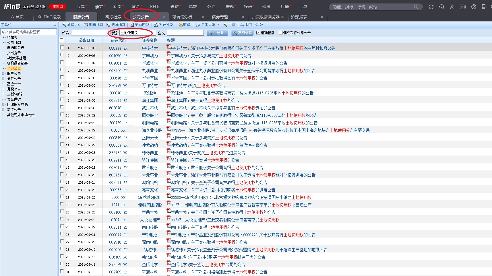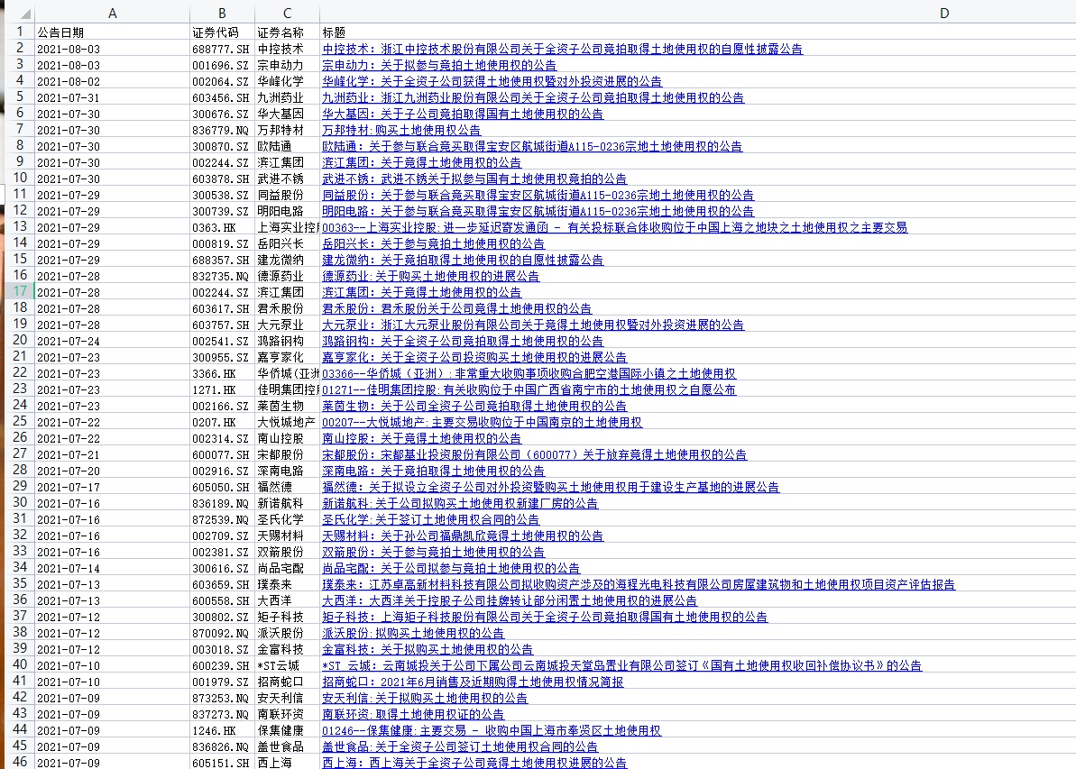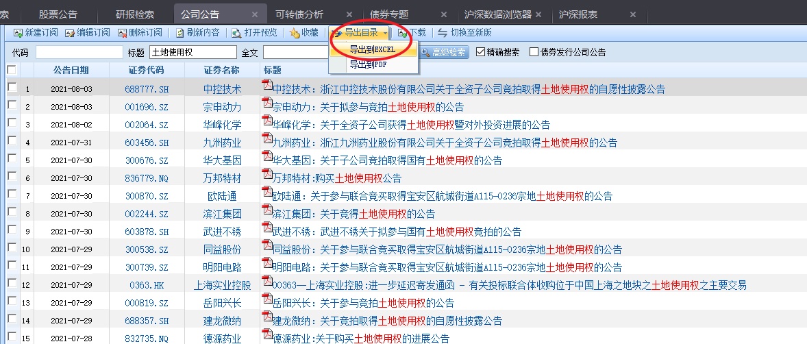 所以,我们搜索股票公告,输入关键词:土地使用权,就可以查找出哪些企业正准备在未来扩建或新建项目。
