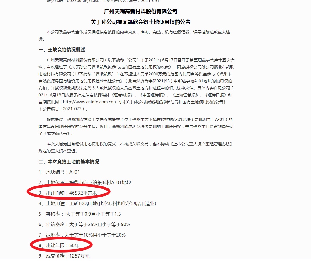 以天赐材料为例,公告里面会说明竞拍土地基本情况,还有最关键的用途:本次竞得上述国有土地使用权是为了满足福鼎凯欣年产 10 万吨锂电池电解液项目建设需要。