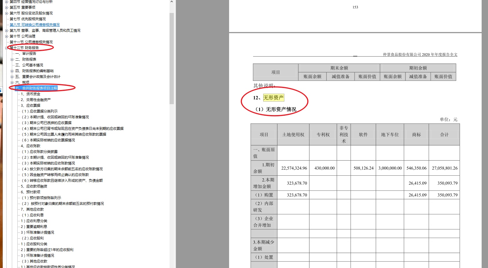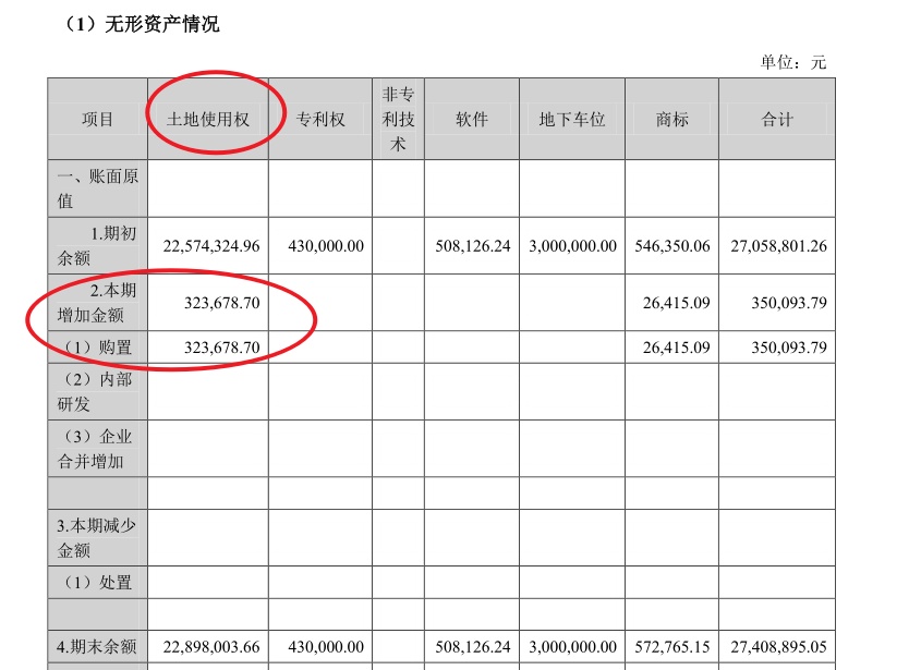 所以,也可以在企业的财报中查看无形资产这个类目中的土地使用权情况,一般是在:财务报告——合并财务报表项目注释——无形资产情况: