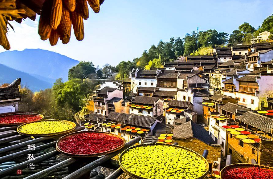 在湖南、江西、安徽等生活在山区的村民,由于地势复杂,村庄平地极少,每年立秋,随着果蔬的成熟,利用房前屋后及自家窗台、屋顶架晒或挂晒农作物,进入了晒秋最旺季节。在江西婺源的篁岭古村,晒秋已经成了农家喜庆丰收的“盛典”,篁岭晒秋被文化部评为“最美中国符号”之后,其更演变成乡村旅游提升的“图腾”和名片,每年吸引数十万人去篁岭赏秋拍摄。