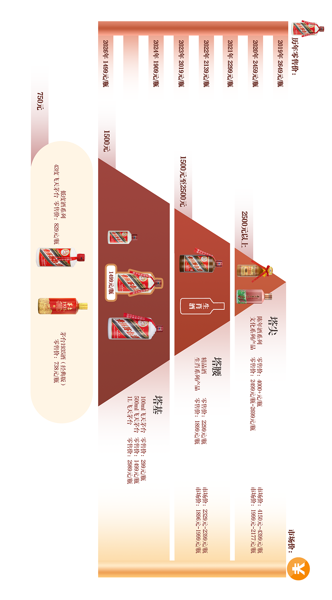 产品体系上,茅台明确回归“金字塔”结构。塔基以飞天茅台为主,强化当年酒的社交消费与往年酒的收藏属性;塔腰聚焦精品与生肖系列,意图打造新的大单品与收藏热点;塔尖则收缩陈年与文化系列,以维护超高端产品价值。
