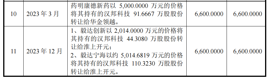 2023年3月,药明康德新药以5,000.00万元的价格将其持有的公司91.6667万股股份转让给华金领越;2023年12月,毅达宁海以约5,014.68万元的价格将其持有的公司110.3230万股股份转让给淮上开元,毅达创新以2,014.00万元的价格将其持有的公司44.3080万股股份转让给淮上开元。毅达宁海、毅达创新不再是公司股东。