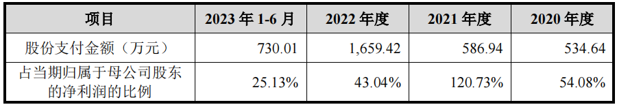 报告期各期,股权激励相关的股份支付金额分别为534.64万元、586.94万元、1659.42万元和730.01万元,占当期归母净利润的比例分别为54.08%、120.73%、43.04%和25.13%。