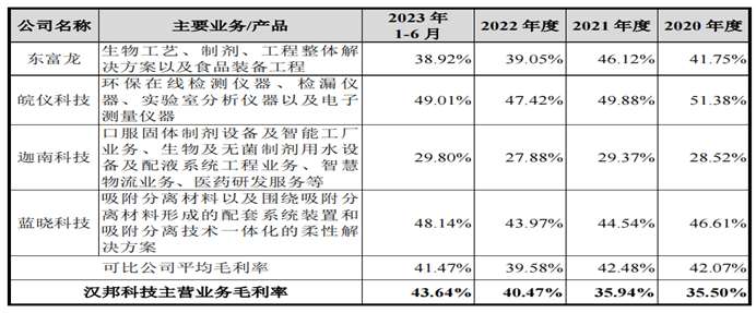 报告期内,公司的主营业务毛利率分别为35.50%、35.94%、40.47%和43.64%。2020年和2021年低于可比同行均值42.97%和42.48%,2022年和2023年1-6月高于可比同行均值39.58%和41.47%。