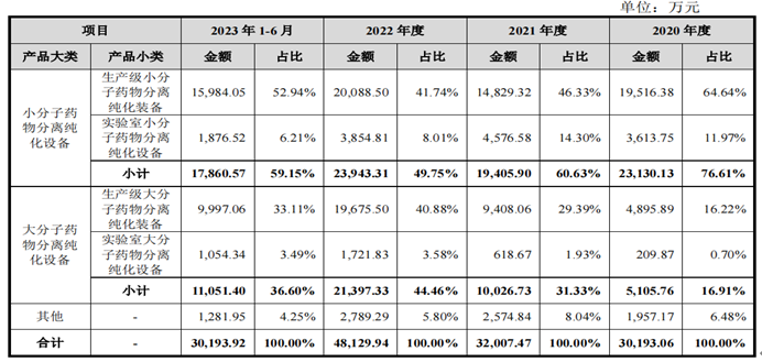 汉邦科技主要产品按类型可分为小分子药物分离纯化设备、大分子药物分离纯化设备等,可广泛应用于工业生产和实验室研发的各类应用场景中。报告期各期,大分子药物分离纯化设备、小分子药物分离纯化设备两大产品线收入占比超过90%,是公司收入的主要来源。
