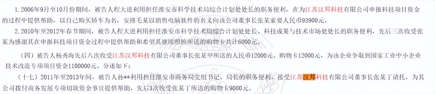 此外,据裁判文书网(2015)淮中刑二初字第00007号、(2017)苏0813刑初207号和(2015)河刑初字第00087号显示;汉邦科技和董事长张某涉及原任淮安市商务局党组书记、局长孙健、原淮安市科学技术局综合计划处长程大进、原招商处处长杨秀海三人的受贿案件中;可见其经营规范性有所不足。