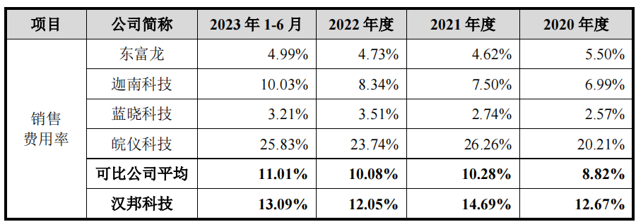 报告期内,汉邦科技期间费用分别为9,134.85万元、9,816.55万元、1.314亿元和8,057.38万元,占营业收入比重分别为30.22%、30.63%、27.27%和26.66%。其中,报告期内,公司销售费用分别为3,829.92万元、4,708.82万元、5,806.93万元和3,956.39万元,占营业收入比例分别为12.67%、14.69%、12.05%和13.09%。公司销售费用率高于同行业可比公司平均销售费用率8.82%、10.28%、10.08%和11.01%。