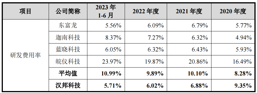 截至2023年6月30日,汉邦科技拥有核心技术人员5人,公司研发人员合计114人,占全部员工的18.97%。报告期内,公司研发费用分别为2,827.02万元、2,204.12万元、2,899.26万元和1,724.77万元,占营业收入的比例分别为9.35%、6.88%、6.02%和5.71%,研发费用率下滑,2021年-2023年1-6月低于可比同行均值10.10%、9.89%和10.99%。