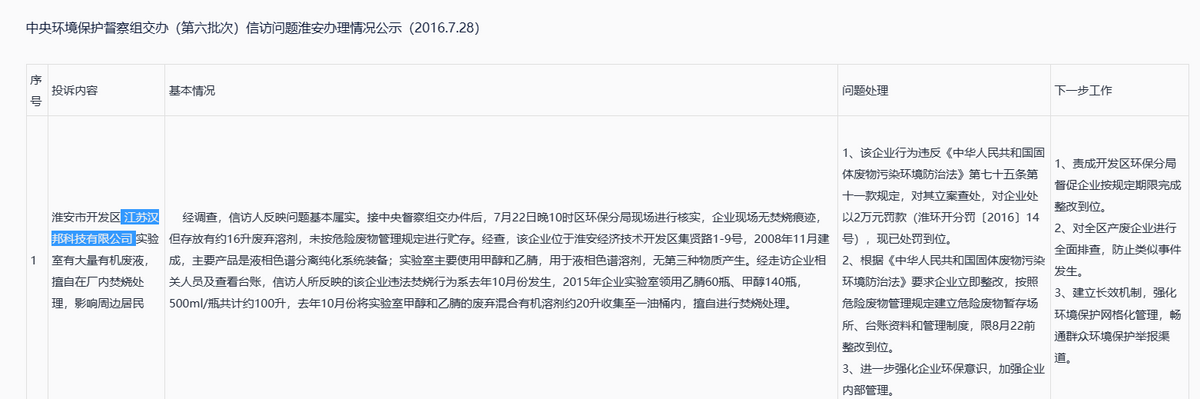 2020年4月,公司受到淮安市应急管理局关于“江苏汉邦科技有限公司未按规定对从业人员进行安全生产教育和培训”(苏淮开安监罚〔2020〕安C019号)的行政处罚,处罚金额为7,500元。此外,汉邦科技曾在2016年违反固废法规定,对其立案查处,被处以2万元罚款(淮环开分罚〔2016〕14号)。