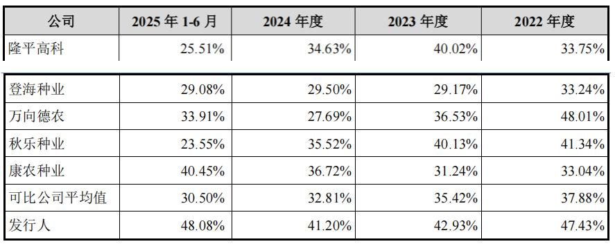 玉米现货价格自2023年8月起下行,同行业可比公司2024年、2025年上半年营业收入、净利润、毛利率整体呈下降趋势。公司营业收入变化与可比公司平均值相近,但2025年上半年净利润较上年同期增长55.80%、毛利率增长近7个百分点,与可比公司趋势相反,主要系制种成本降低所致。
