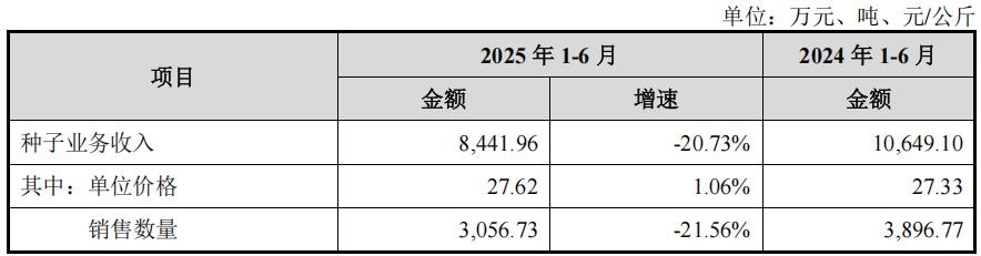 2025年1-6月,种子业务收入下降主要系销售数量下滑约21.56%。销售数量下滑较多的主要原因为2024-2025销售季(2024年第四季度至2025年第三季度)因春节较2023-2024销售季提前12天,导致客户提货节奏加快,2024年第四季度提货规模增多。该销售季集中在
