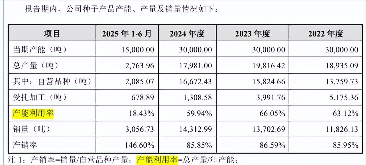 从产能利用率上看,公司的产能利用率持续位居低位,报告期未超过67%的线,2025年上半年仅18.43%。报告期内,公司在湖北省襄阳市、云南省玉溪市、甘肃省张掖市建立种子加工厂,年产能为3万吨。报告期内,公司种子产能利用率较低,公司解释主要系农作物种植存在显著的季节性特征;2022至2024年,公司玉米种子的产销率在85%左右,生产与销售情况相对匹配。