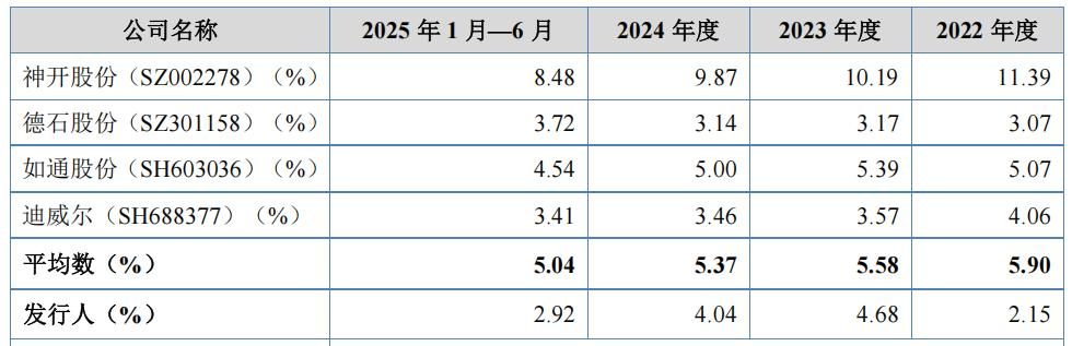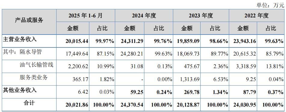 2022年-2025年1-6月,隔水导管的销售收入占营业收入的比例分别为85.79%、89.77%、99.63%和87.15%,产品结构相对单一。