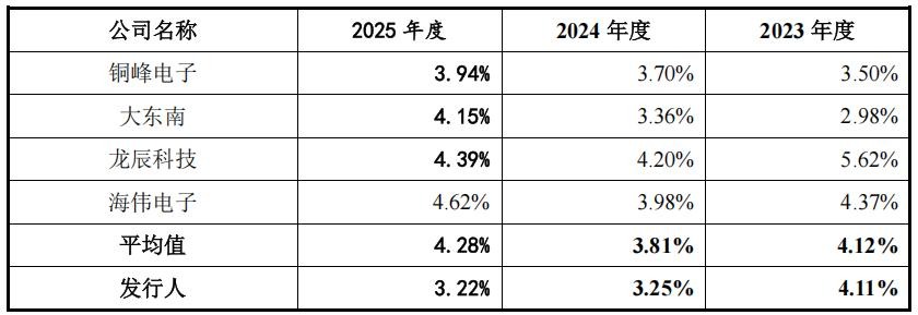 报告期内,嘉德利研发费用分别为2,172.37万元、2,388.40万元和2,437.22万元,占营业收入比例分别为4.11%、3.25%和3.22%,低于同行业可比公司平均研发费用率4.12%、3.81%和4.28%。