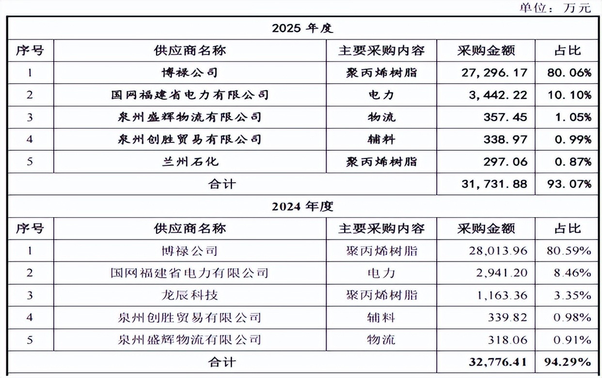 报告期内,公司主要向博禄公司采购北欧化工生产的聚丙烯树脂。博禄公司系总部位于阿联酋阿布扎比的全球领先的石化企业,系北欧化工树脂材料在中国的唯一经销商,北欧化工总部位于奥地利,其树脂材料在比利时生产后,由比利时的港口出发经好望角航线运抵中国大陆。公司报告期内向其采购聚丙烯树脂的金额分别为2.383亿元、2.801亿元和2.73亿元,占原材料采购金额的比例分别为95.54%、90.74%和92.45%。