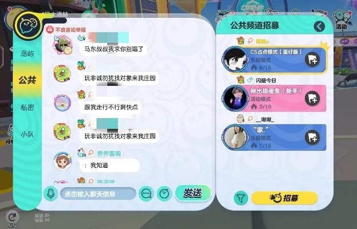 《蛋仔派对》公共频道聊天,是很多小学生喜欢的聚集地。但从“极点商业”观察来看,这也是很可能影响小学生身心健康的地方。