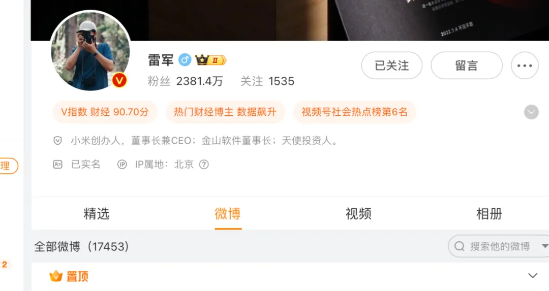 如今微博粉丝2381万的雷军,是最早入驻微博的行业大佬,截至目前发了17453条微博,可以说是最爱发微博的CEO,所有内容基本和小米相关,是小米最好的“营销官”。背后,是涉及策划、拍摄、剪辑、传播等在内的庞大团队的支撑。