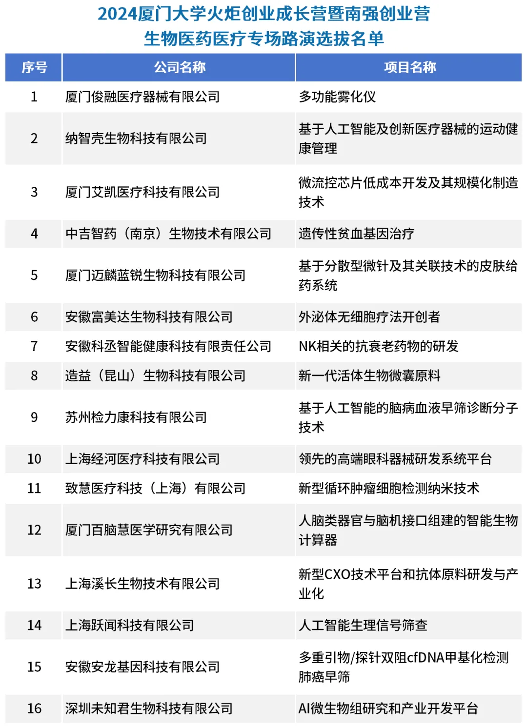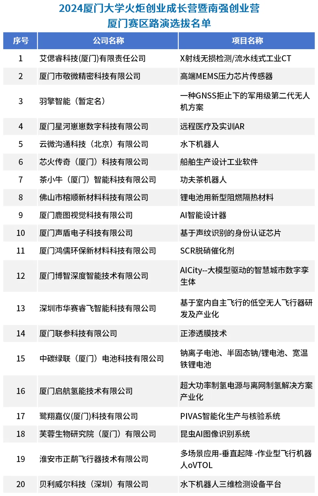 2024厦大火炬创业成长营暨南强创业营厦门赛区路演名单公布