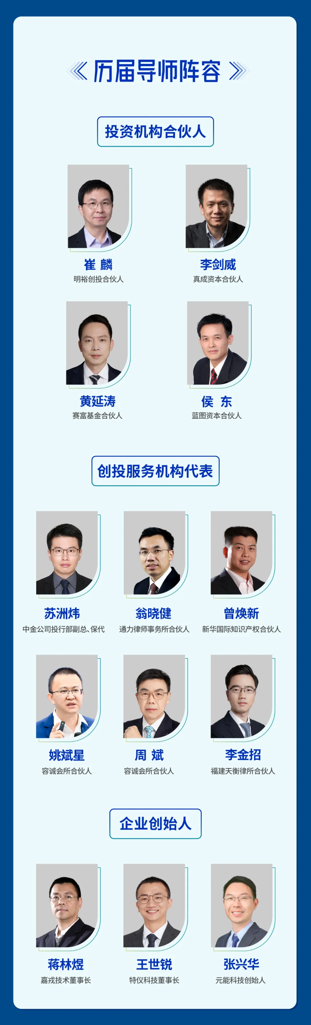 创业营导师往往是顶尖投资机构的合伙人、已投成功案例的项目或其他大型企业的创始人、知名律所或会计师事务所的合伙人,用一线合伙人的实际经验为创业者解决创业过程中的实际问题。