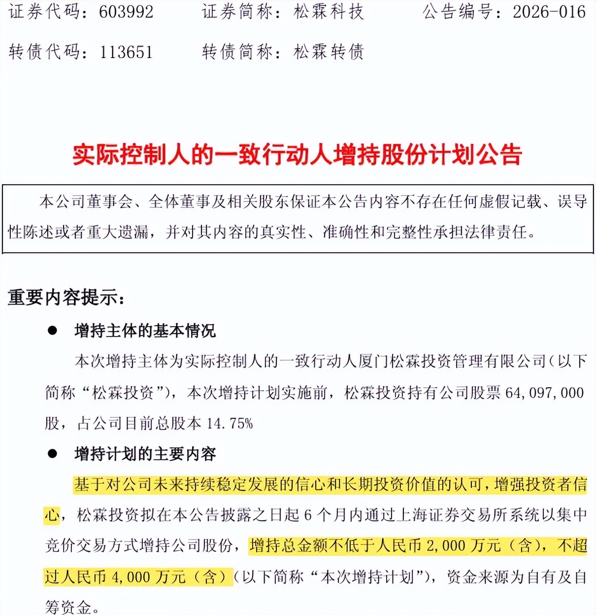 3月12日晚间松霖科技(603992.SH)披露,公司实控人控制的松霖投资计划在6个月内增持股份,增持总金额在人民币2000万元——4000 万元之间。