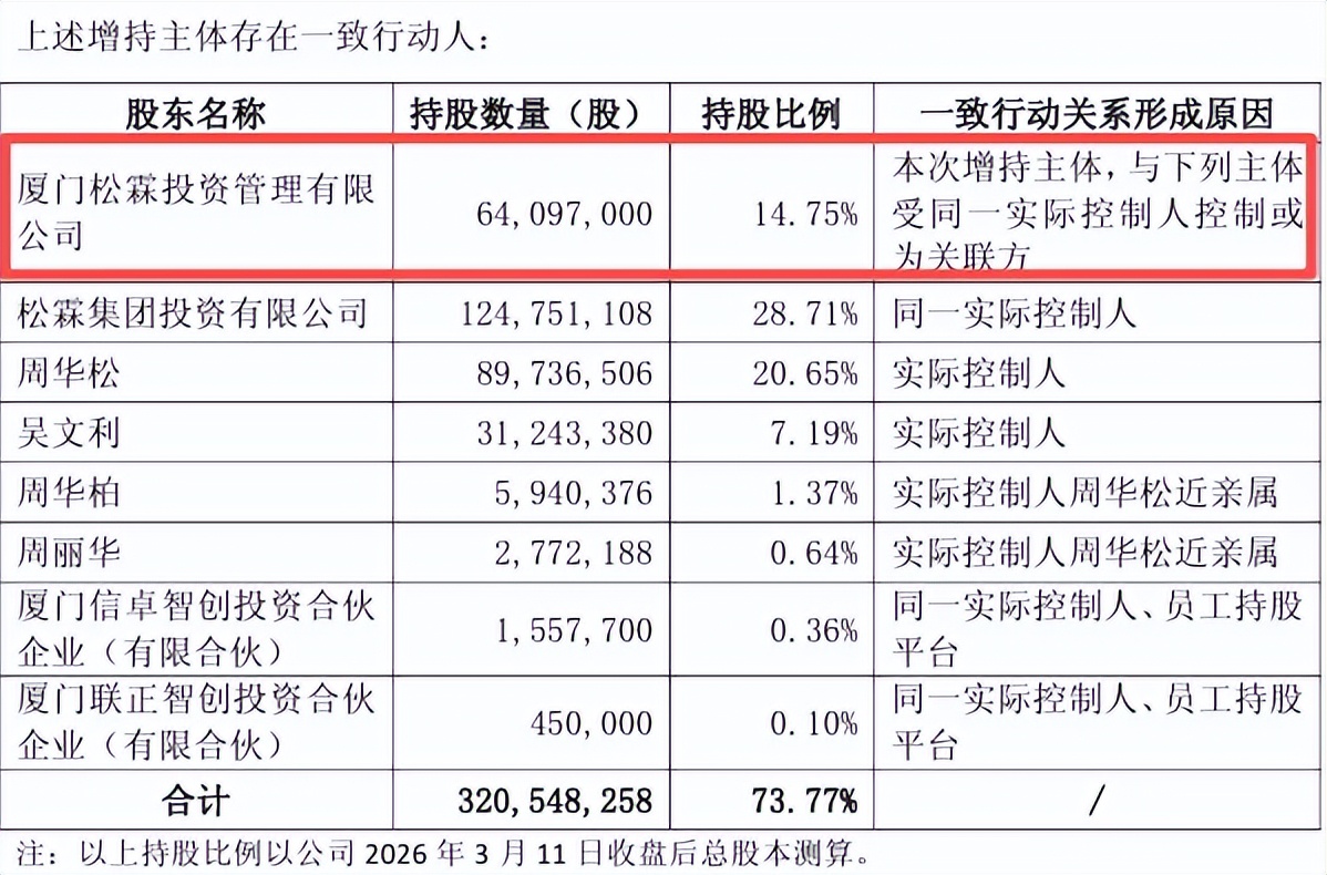 截至3月11日收盘,周华松与吴文利夫妇及其一致行动人共在松霖科技持股73.77%。其中,松霖投资持股14.75%。