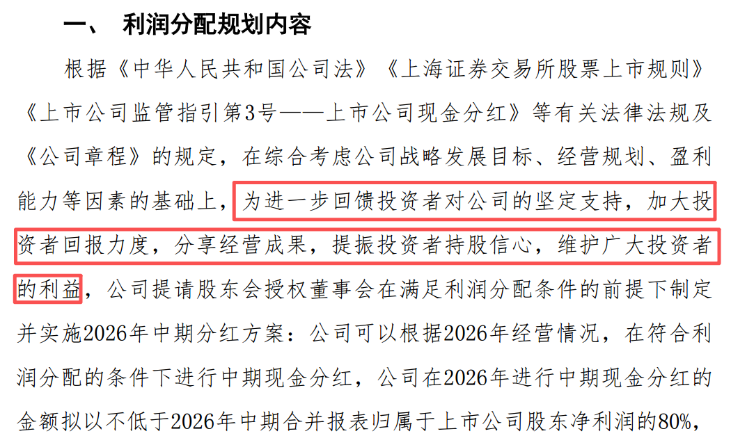 当晚,公司还公告了一份十分大方的2026年中期利润分配规划:以不低于2026年中期归母净利润的80%进行现金分红(不进行资本公积金转增股本,不送红股)。目前,该计划尚需提交公司2025年年度股东会审议。