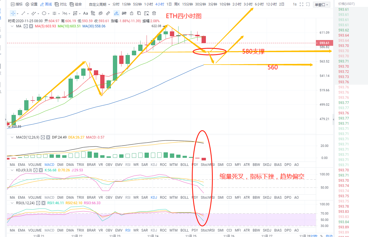 以太坊四小时线来看,昨天冲击622新高后开启震荡下行走势,看下指标,5日均线下挫与10日均线护具,后市可能死叉,K线已经连续几个周期十字星,短期有下探测试支撑的需求。MACD快慢线死叉,空头柱开始放量,KDJ和RSI指标均向下发散。综合来看短期趋势偏空,币价仍需回踩,力度不可测,我们操作上高抛低吸即可,等待优势点位进场,关注上方600,下方关注580