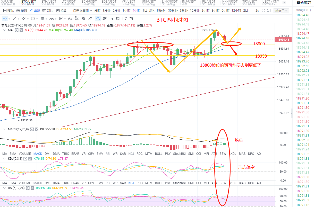 比特币四小时线来看,昨天冲击高点19424后币价开始回踩,最深插针到18850附近,早间收完先后还是保持下行调整,看下指标,下方各均线保持多头排列,MACD快慢线于0轴上方金叉运行,多头柱目前出现缩量,KDJ三线向下聚合,RSI于超买区向下运行。综合来看四小时级别回踩需求较强,指标偏向空头,关注18800这个位置破位的话可能会去18300的。短期关注上方阻力19300,下方18800支撑,操作上低多为主。