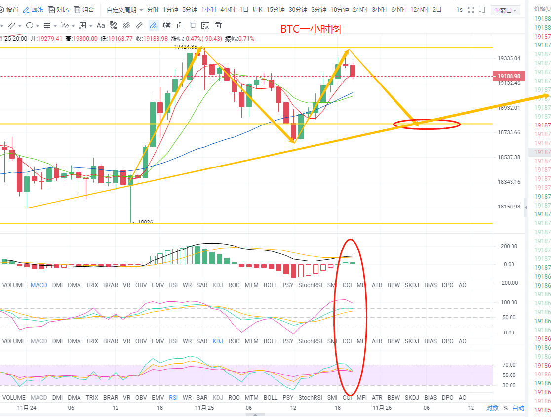 比特币一小时级别来看,下午多头发力,小幅拉升,前面六连阳随后一个高位阴十字,看下目前的指标形态,MACD快慢线金叉后再次粘合,多头柱放量不足,后市可能会再次死叉,KDJ三线拐头向下运行,RSI触及超买区后向下汇聚,再看K线,一个M头的形态,夜间大概率会回踩至18800附近,激进点可以现价轻仓空一下,稳健还是等回踩至下方做多,毕竟目前的大趋势还是多头强。