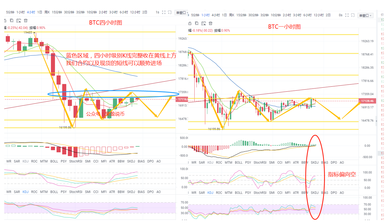 比特币四小时级别,K线晚间收阳,均线交叉呈金叉,MACD快慢线金叉,多头柱开始放量,KDJ三线呈上行状态,RSI三线聚合向下;再看一小时级别,币价晚间冲高受阻17200有所回落,目前运行在17100附近,看下小时级别指标,晚间冲高均线呈金叉目前并未向上发散,MACD快慢线走近,多头柱再次缩量,后市可能死叉,KDJ三线向下聚合,RSI于超买区附近向下运行;