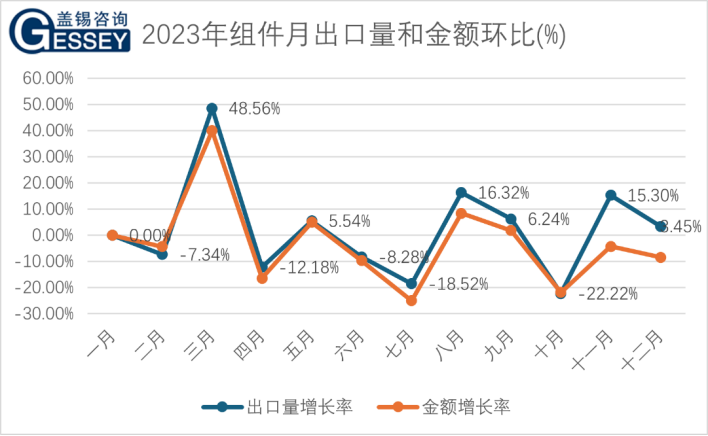 分析同比增长率可知:大多数月份的出口量和金额同比增长率均为正值,出口量和金额都经历了增长。最高增长出现在十二月,增长率达到了56%,其次是十一月和四月,增长率分别为40%和38%。金额最高增长出现在三月,增长率为27%,同样的出口量与金额的变动趋势一致,说明组件的价格变化不大,单价非常稳定。