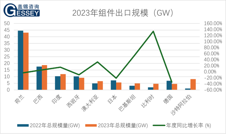 从组件出口国家来看,2023年出口排名前三的国家为荷兰、巴西和印度。