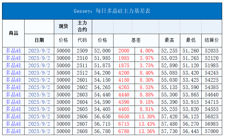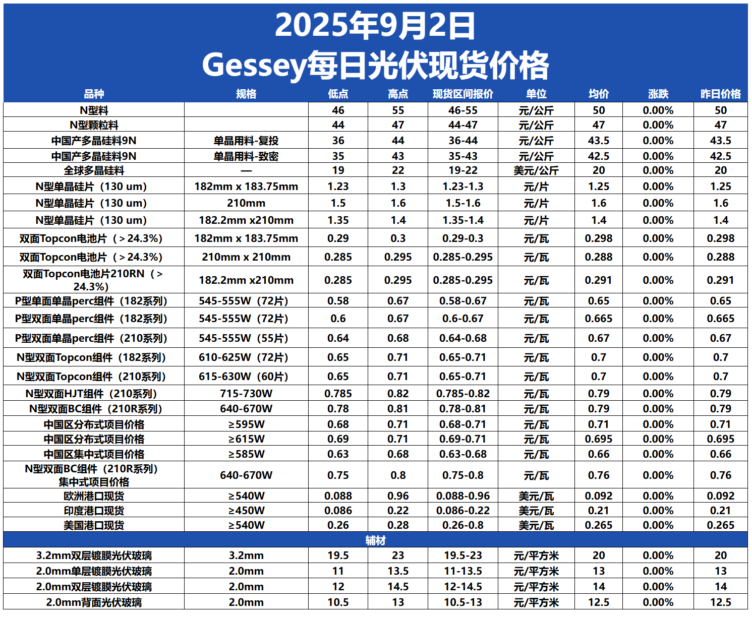 今日硅料价格整体维稳,N型料主流价格在46-55元/公斤,均价50元/公斤。N型颗粒硅主流价格在44-47元/公斤,均价47元/公斤。国产复投特级硅料主流价格在36-44元/公斤,均价43.5元/公斤,国产致密特级硅料主流价格在35-43元/公斤,均价42.5元/公斤。全球多晶硅料主流价格在19-22元/公斤,均价20元/公斤。