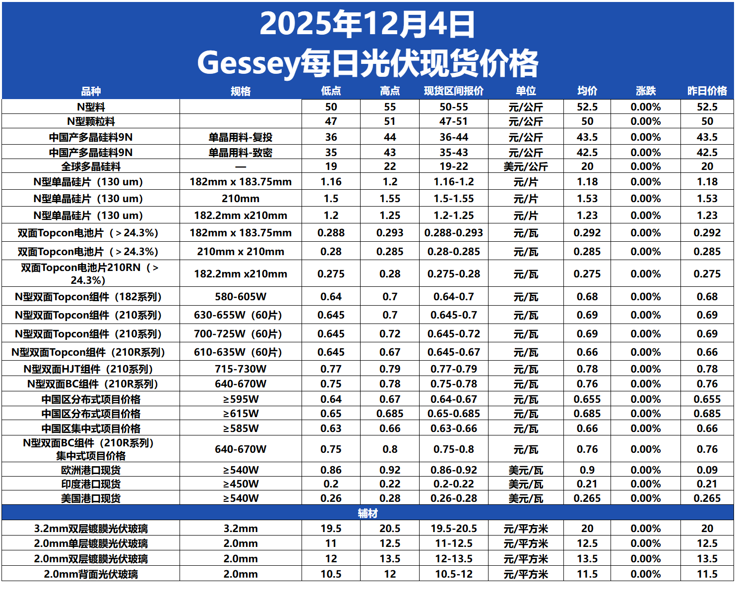 今日组件价格整体维稳,N型双面Topcon 组件(182系列)价格在0.64-0.7元/ 瓦,均价为0.68元/瓦。N型双面Topcon 组件(210系列)价格在0.645-0.7元/ 瓦,均价为0.69元/瓦。N型双面Topcon组件(210系列)(700-725W(60片)价格在0.645-0.72元/ 瓦,均价为0.69元/瓦。N型双面Topcon组件(210R系列)(610-635W(60片))价格在0.645-0.67元/ 瓦,均价为0.66元/瓦。N型双面HJT组件(210系列)价格在0.77-0.79元/ 瓦,均价为0.78元/瓦。N型双面BC组件(210R系列)价格在0.75-0.78元/ 瓦,均价为0.76元/瓦。中国区分布式项目(≥595W)价格在0.64-0.67元/瓦,均价为0.655元/瓦,中国区分布式项目(≥615W)价格在0.65-0.685元/瓦,均价为0.685元/瓦,中国区集中式项目(≥585W)价格在0.63-0.66元/ 瓦,均价为0.66元/瓦。N型双面BC组件(210R系列)集中式项目价格在0.75-0.8元/ 瓦,均价为0.76元/瓦。欧洲港口现货价格在0.86-0.92美元/ 瓦,均价为0.9美元/瓦。印度港口现货价格在0.2-0.22美元/ 瓦,均价为0.21美元/瓦。美国港口现货价格在0.26-0.28美元/ 瓦,均价为0.265美元/瓦。