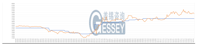 行情走势:主力合约收盘价为58000元/吨,前结算价为59045元/吨,收盘价较前结算价跌幅为1.77%,收盘价较开盘价跌10元/吨,跌幅为0.02%,成交量为16手,持仓量为363手。