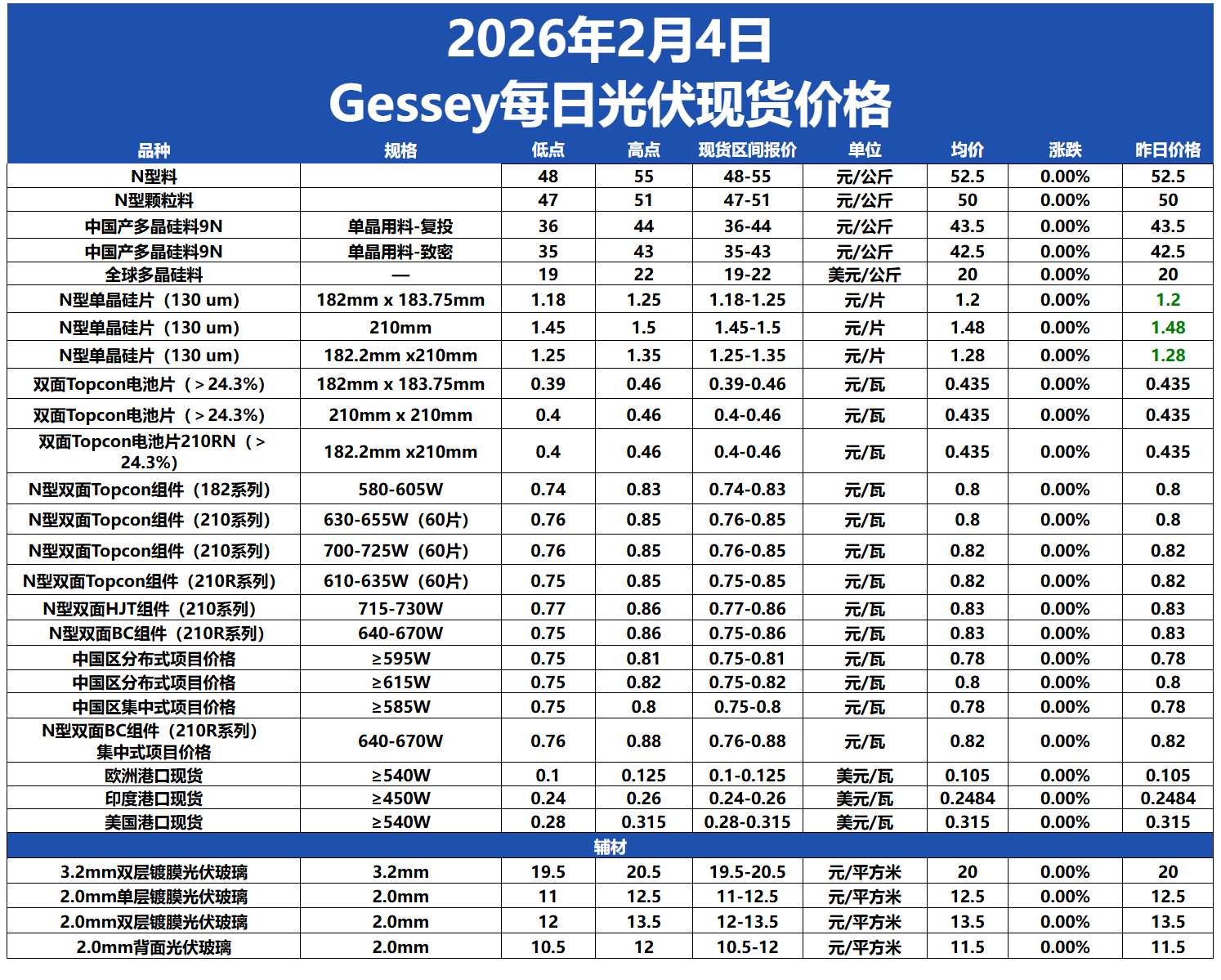 今日组件价格整体维稳,N型双面Topcon 组件(182系列)价格在0.74-0.83元/ 瓦,均价为0.8元/瓦。N型双面Topcon 组件(210系列)价格在0.76-0.85元/ 瓦,均价为0.8元/瓦。N型双面Topcon组件(210系列)(700-725W(60片)价格在0.76-0.85元/ 瓦,均价为0.82元/瓦。N型双面Topcon组件(210R系列)(610-635W(60片))价格在0.75-0.85元/ 瓦,均价为0.82元/瓦。N型双面HJT组件(210系列)价格在0.77-0.86元/ 瓦,均价为0.83元/瓦。N型双面BC组件(210R系列)价格在0.75-0.86元/ 瓦,均价为0.83元/瓦。中国区分布式项目(≥595W)价格在0.75-0.81元/瓦,均价为0.78元/瓦,中国区分布式项目(≥615W)价格在0.75-0.82元/瓦,均价为0.8元/瓦,中国区集中式项目(≥585W)价格在0.75-0.8元/ 瓦,均价为0.78元/瓦。N型双面BC组件(210R系列)集中式项目价格在0.76-0.88元/ 瓦,均价为0.82元/瓦。欧洲港口现货价格在0.1-0.125美元/ 瓦,均价为0.105美元/瓦。印度港口现货价格在0.24-0.26美元/ 瓦,均价为0.2484美元/瓦。美国港口现货价格在0.28-0.315美元/ 瓦,均价为0.315美元/瓦。