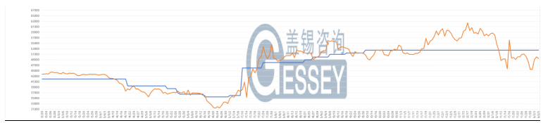 行情走势:主力合约收盘价为49490元 / 吨,前结算价为50140元/吨,收盘价较前结算价跌幅为1.30% ,收盘价较开盘价跌0元/吨,跌幅为0.00%,成交量为25手,持仓量为120手。