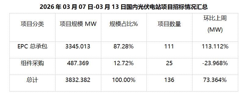根据Gessey盖锡咨询统计,2026年03月07日-03月13日累计光伏招标项目为136个,项目规模合计为3832.382MW。光伏组件采购招标项目为25个,招标规模为487.369MW,环比上周-23.968%。EPC总承包招标项目为111个,招标规模为3345.013MW,环比上周113.112%。
