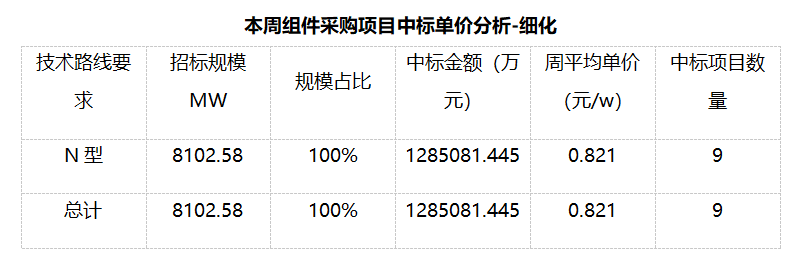 本周光伏组件采购中标规模达8102.58MW,总中标金额1285081.445万元,平均中标单价为0.821元/W,中标数量9个。