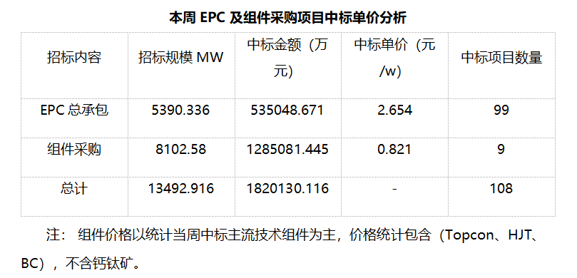 本周光伏EPC总承包中标规模达5390.336MW,总中标金额535048.671万元,平均中标单价为2.654元/W,中标数量99个。