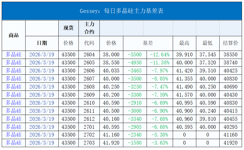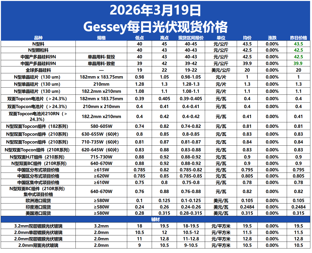 今日硅料价格整体维稳,N型料主流价格在40-45元/公斤,均价43.5元/公斤。N型颗粒硅主流价格在40-43元/公斤,均价42.5元/公斤。国产复投特级硅料主流价格在40-43元/公斤,均价42.5元/公斤,国产致密特级硅料主流价格在39-42元/公斤,均价39.9元/公斤。全球多晶硅料主流价格在19-22元/公斤,均价20元/公斤。