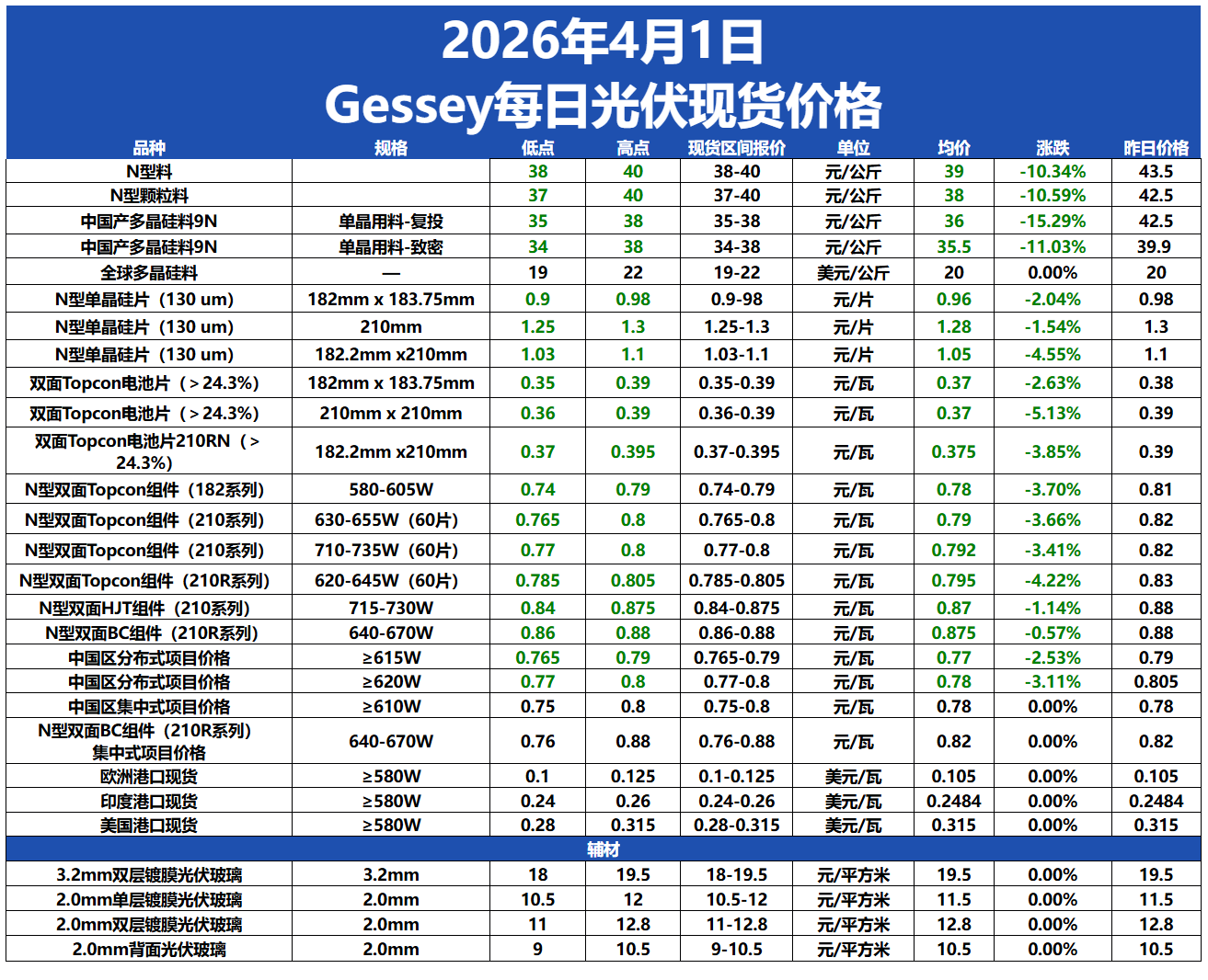 组件方面,本周小幅让利,现货报价跌破0.8元/瓦,主流维持0.77-0.78元/瓦,尽管本轮调价幅度相对明显,但多数企业当前排产仅为3月份的半数左右,整体市场价格仍以小幅波动为主。市场普遍预期,本轮调价后不会持续降价,后续价格杀跌空间已逼近成本线,即便继续调整,幅度也会相对有限。今日组件价格小幅下跌,N型双面Topcon 组件(182系列)价格在0.74-0.79元/ 瓦,均价为0.78元/瓦,下降3.7%。N型双面Topcon 组件(210系列)价格在0.765-0.8元/ 瓦,均价为0.79元/瓦,下降3.66%。N型双面Topcon组件(210系列)(700-725W(60片)价格在0.77-0.8元/ 瓦,均价为0.792元/瓦,下降3.41%。N型双面Topcon组件(210R系列)(610-635W(60片))价格在0.785-0.805元/ 瓦,均价为0.795元/瓦,下降4.22%。N型双面HJT组件(210系列)价格在0.84-0.875元/ 瓦,均价为0.87元/瓦,下降1.14%。N型双面BC组件(210R系列)价格在0.86-0.88元/ 瓦,均价为0.875元/瓦,下降0.57%。中国区分布式项目(≥615W)价格在0.765-0.79元/瓦,均价为0.77元/瓦,下降2.53%;中国区分布式项目(≥620W)价格在0.77-0.8元/瓦,均价为0.78元/瓦,下降3.11%。