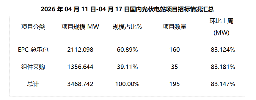 根据Gessey盖锡咨询统计,2026年04月11日-04月17日累计光伏招标项目为195个,项目规模合计为3468.742MW。光伏组件采购招标项目为35个,招标规模为1356.644MW,环比上周-83.181%。EPC总承包招标项目为160个,招标规模为2112.098MW,环比上周-83.124%。