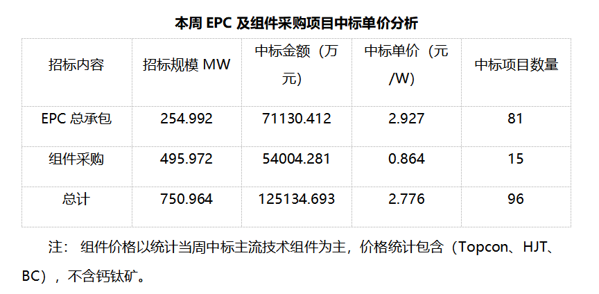 本周光伏EPC总承包中标规模达254.992MW,总中标金额71130.412万元,平均中标单价为2.927元/W,中标数量81个。