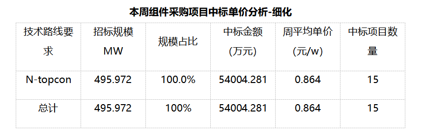 本周光伏组件采购中标规模达495.972MW,总中标金额54004.281万元,平均中标单价为0.864元/W,中标数量15个。